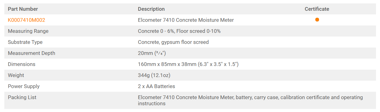 The Elcometer 7410 Concrete Moisture Meter is a non-destructive moisture meter for concrete floors and slabs providing instant and precise quantitative measurement of moisture content using Gravimetric testing as a baseline.