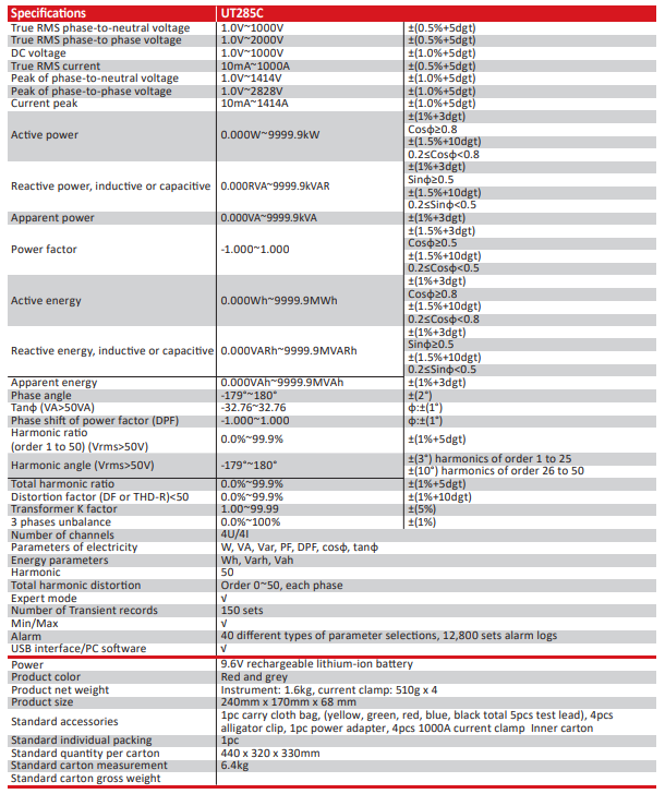 * UT285C is a new product specially designed for power quality analysis. It adopts latest microprocessor technology and digital signal processing technology, which can provide safer, more convenient, and more accurate measurement as well as troubleshoot power supply network.